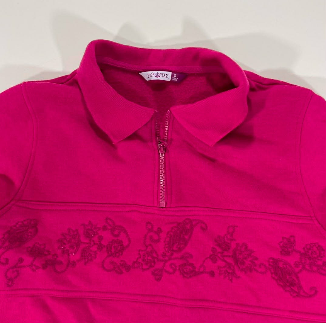 VINTAGE PICK A BERRY PINK QUARTER ZIP SWEATSHIRT WITH FLORAL EMBROIDERY (S-M)